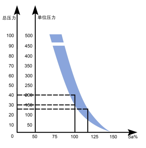 把压出加重率100%(含固率/上浆率≥1)作为高压上浆的起点进行生产实践验证,其中还提出了“相当压浆力”概念。即按照浆纱机本身额定压浆力,最高车速设定,在达到最高车速100 m/min时,压浆力应达到额压浆力40 kN,具体如图1所示。